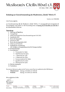 Am Samstag, dem 07.03.2026 findet die alljährliche Generalversammlung des Musikvereins "Cäcilia" Hövel e. V. statt. Der Vorstand lädt alle Mitglieder sehr herzlich ein. Neben den Berichten aus dem vergangenen Jahr und umfangreichen Vorstandswahlen stehen auch eine Beschlussfssung über eine neue Satzung und Beitragsänderungen auf der Tagesordnung.
