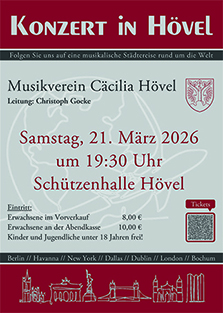 Der Musikverein Hövel lädt am Samstag, 21. März, um 19.30 Uhr zu seinem Frühjahrskonzert in die Schützenhalle Hövel ein. Unter dem Motto „Städtereise“ nehmen die Musiker ihr Publikum mit auf eine abwechslungsreiche musikalische Reise rund um den Globus.