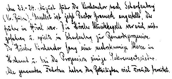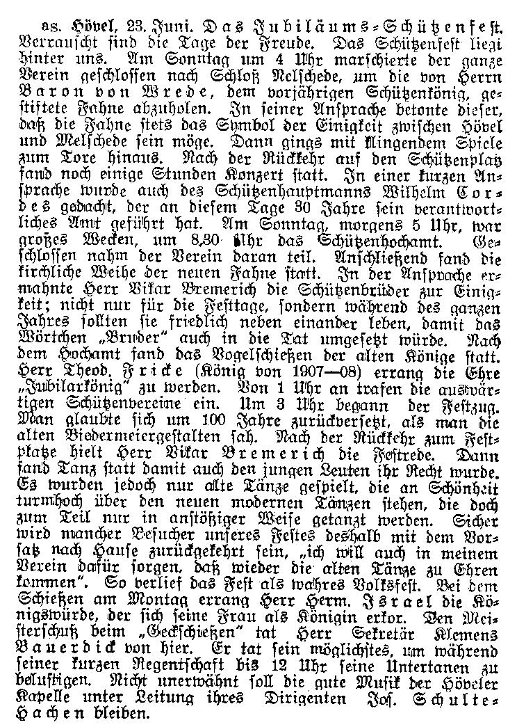 Am 23. und 24. August fuhr der Krichenchor nach Scharfenberg (Kreis Brilon). Daselbst ist jetzt Pastor Gramsch angestellt, der früher in Hövel war. Die Höveler Musikkapelle war auch mitgefahren und spielte in Scharfenberg zur Bernardiprozession. Der Höveler Kirchenchor sang eine mehrstimmige Messe und bei der Prozession einige Sakramentslieder. Alle genannten Fahrten haben den Beteiligten viel Freude bereitet.